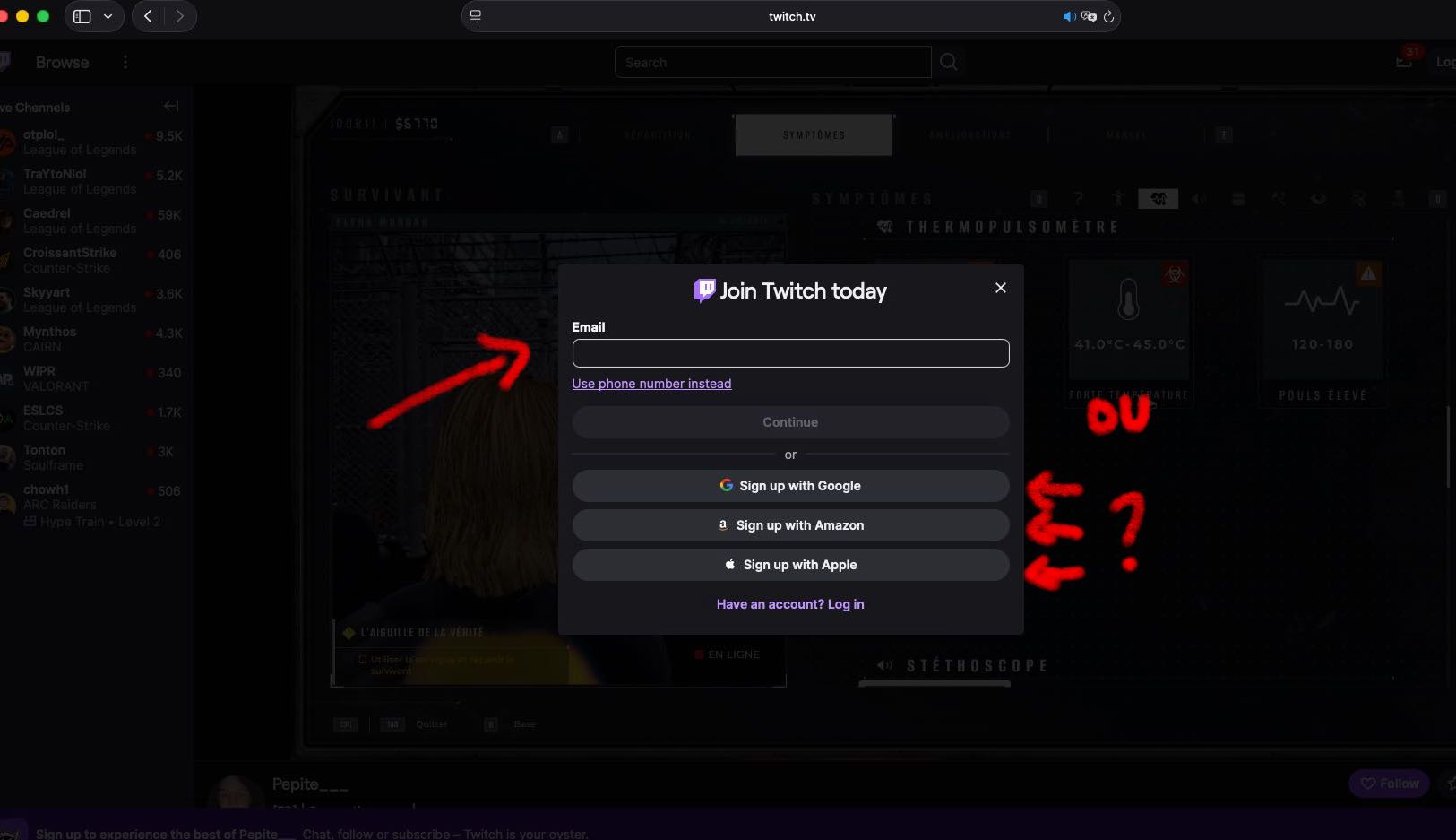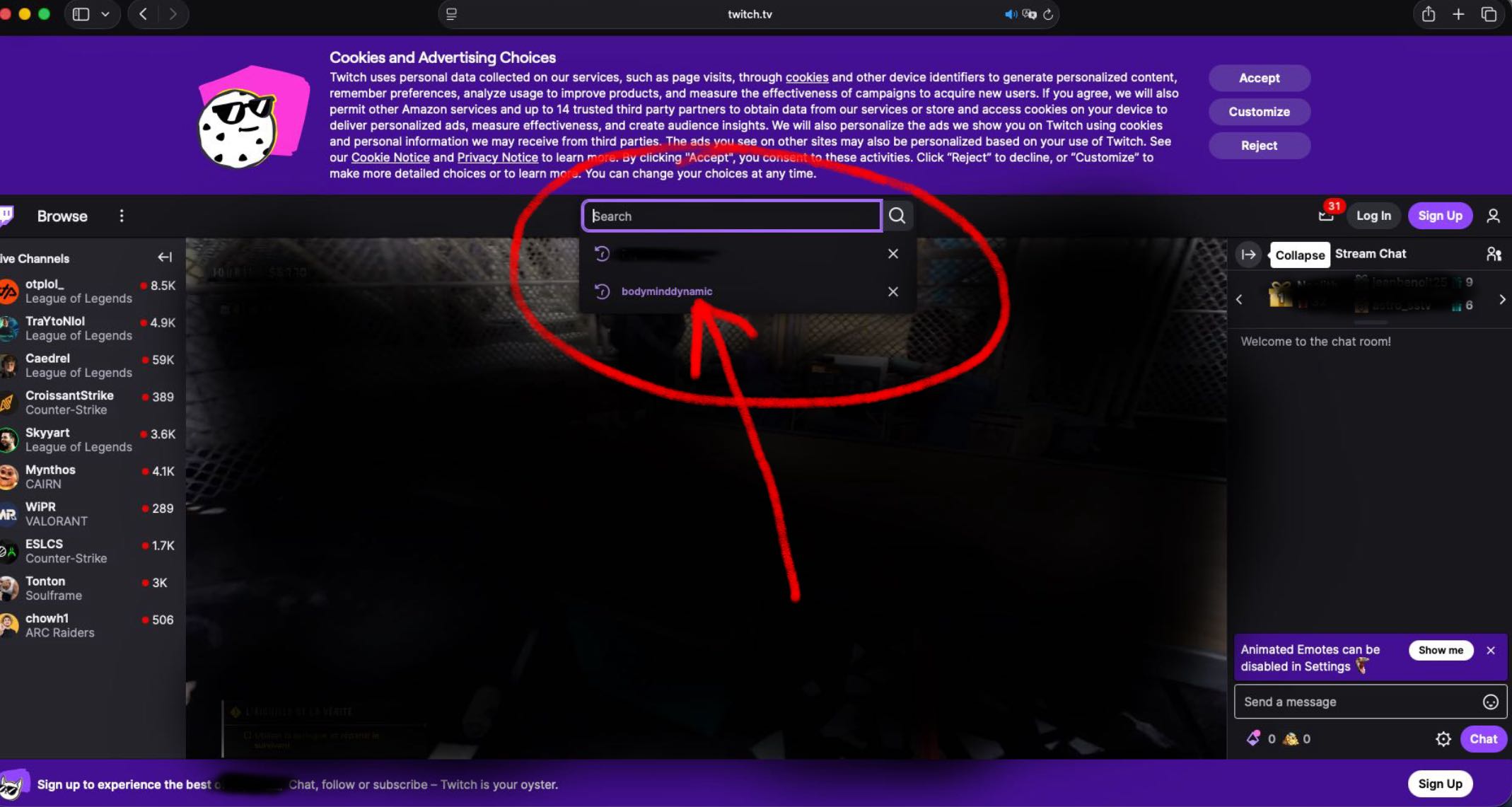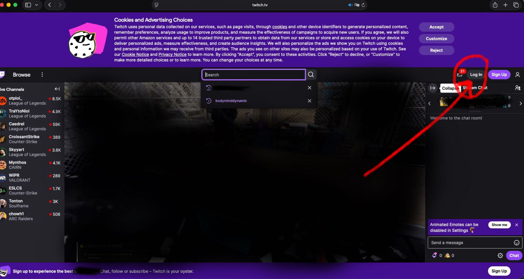 Pour vous inscrire sur Twitch, cliquez sur "sign up"