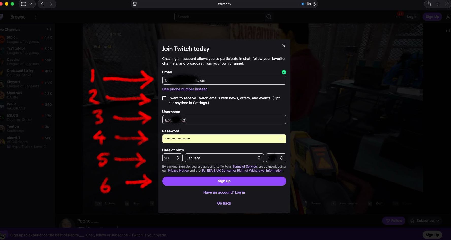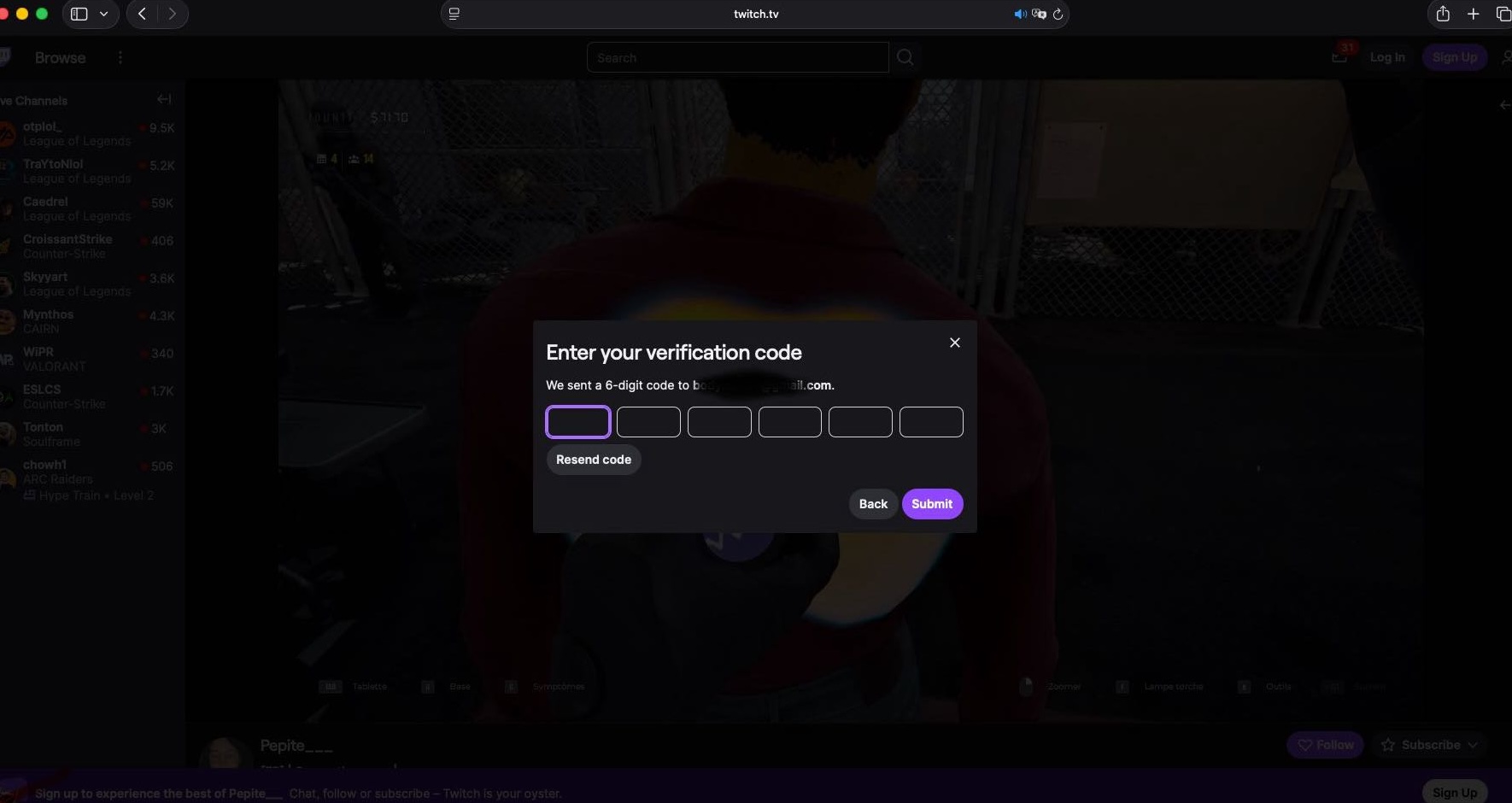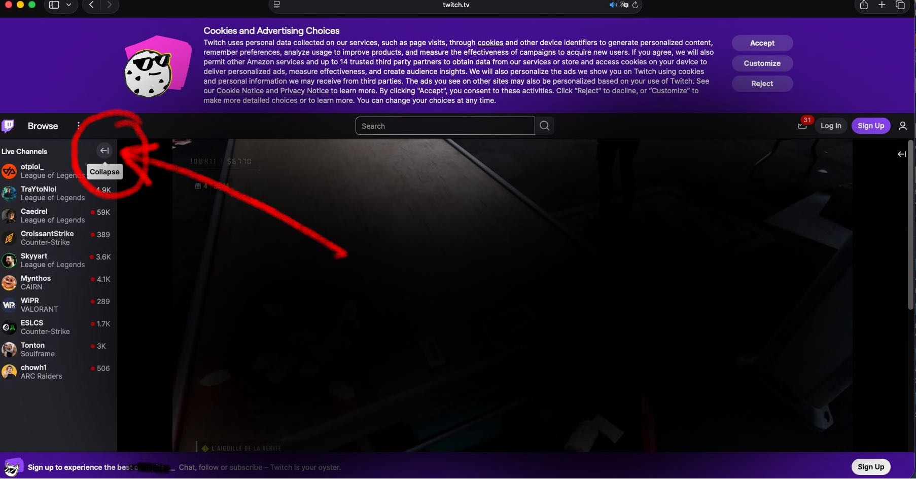 Pour vous inscrire sur Twitch, cliquez sur "sign up"